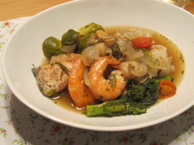 下茹でしたじゃがいも・芽キャベツ・マッシュルーム・玉葱・プチトマトと一緒に、