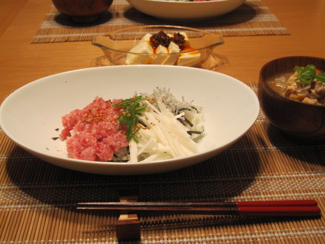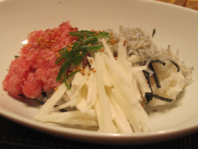 まぐろ・しらす・長芋の千切り、彼は更に納豆ものせてました。