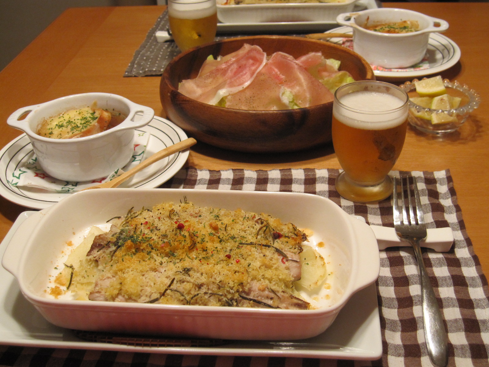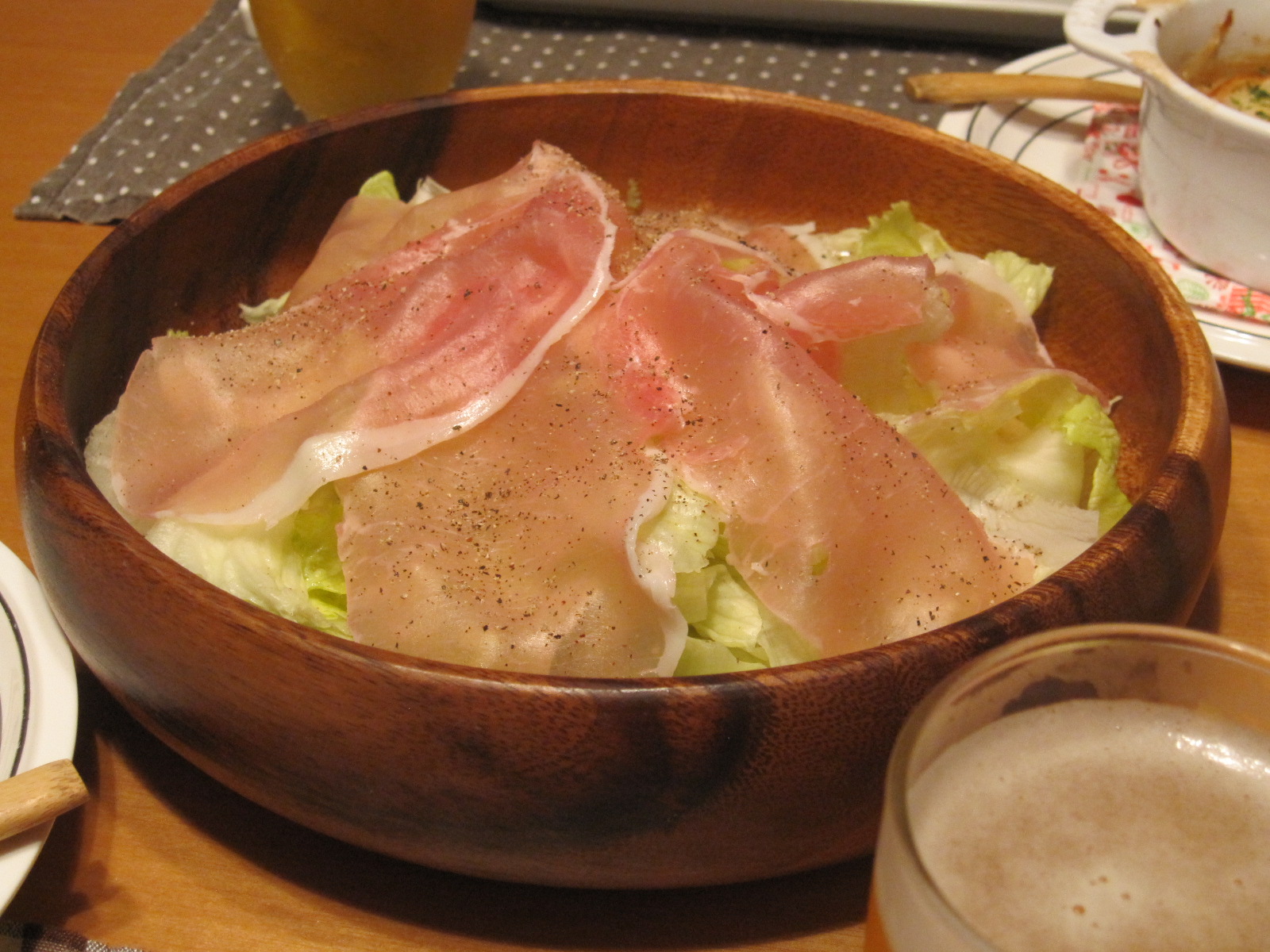サラダはレタスの上に生ハムをのっけただけ。