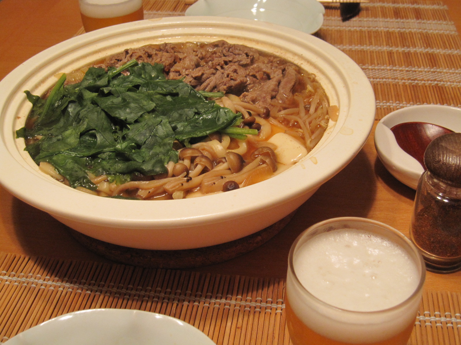 キャベツ・モヤシ・ほうれん草・うどん・豆腐・牛肉。