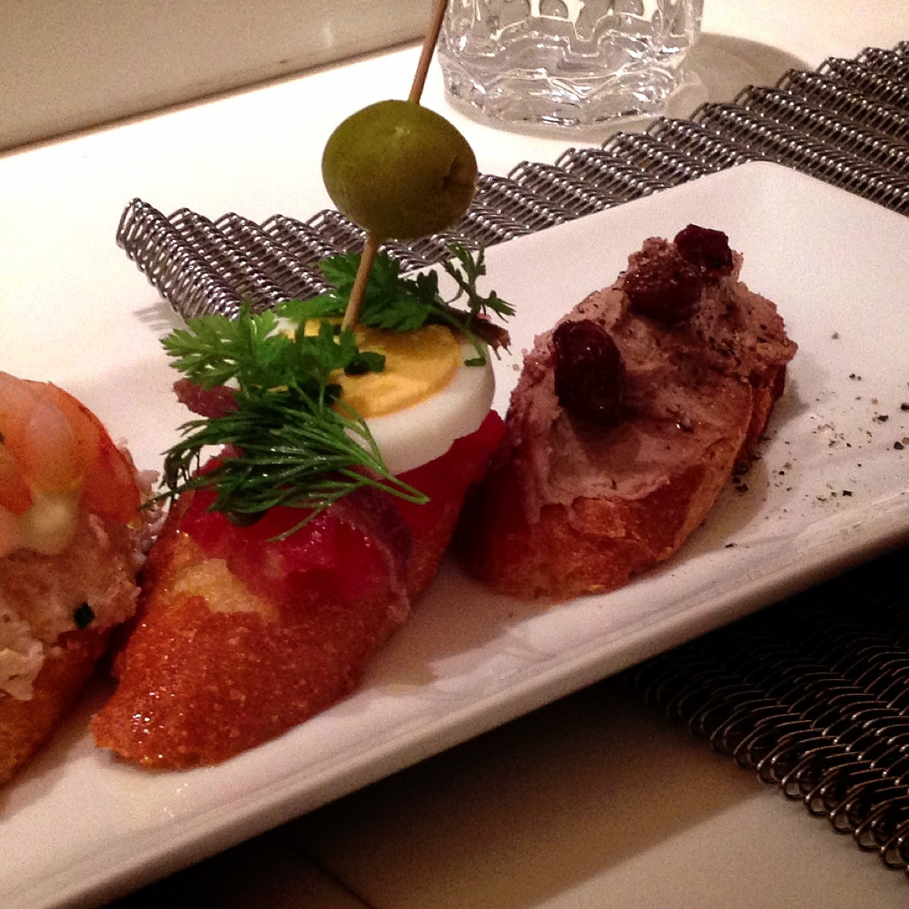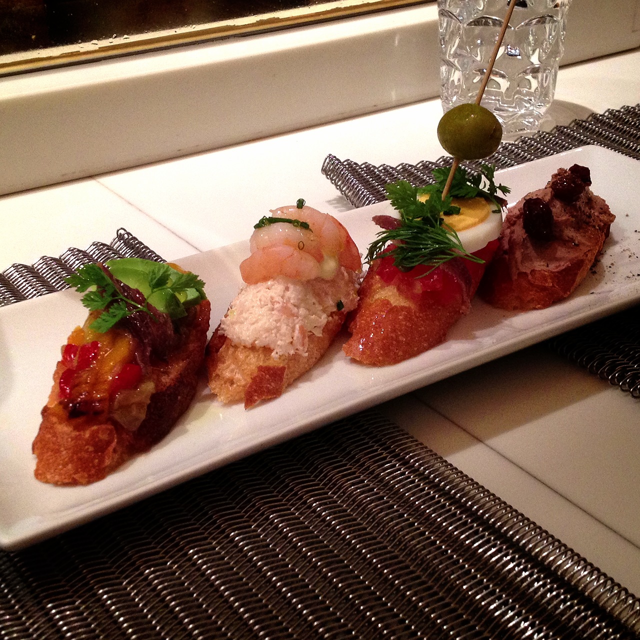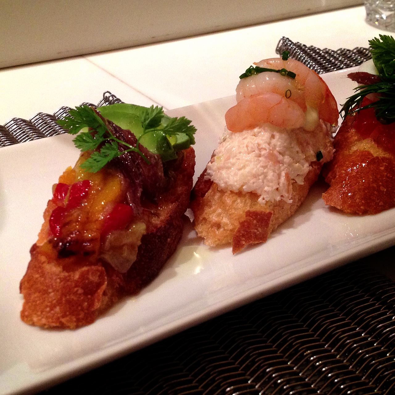 左から、パプリカ&アンチョビ・海老・トマト&サーモン・レバーパテ。