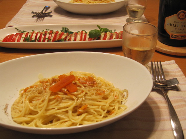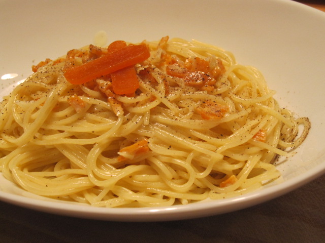 からすみの塩気とクリーム、そしてシャンパンが程良いです。