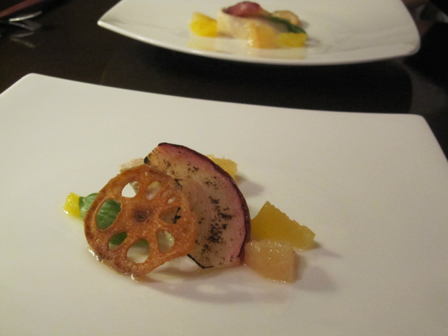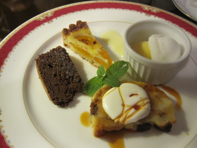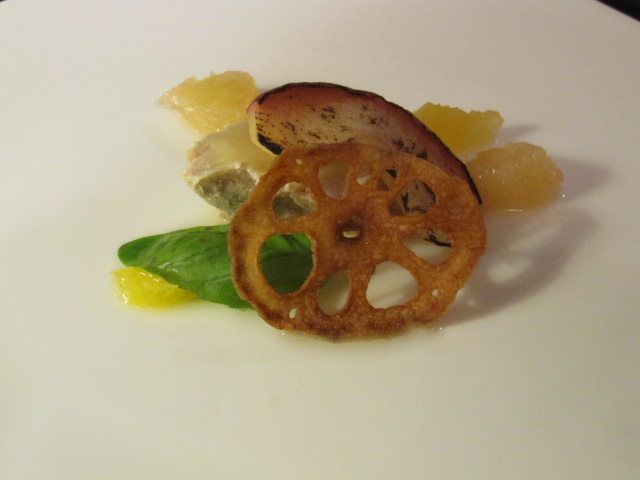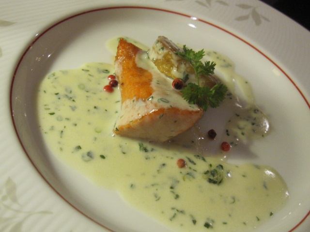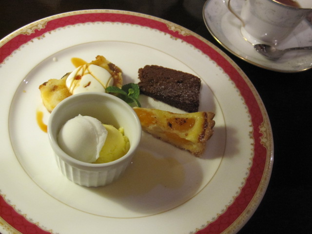 カルバドス(アップルブランディ)ソース、フルーツ添え。