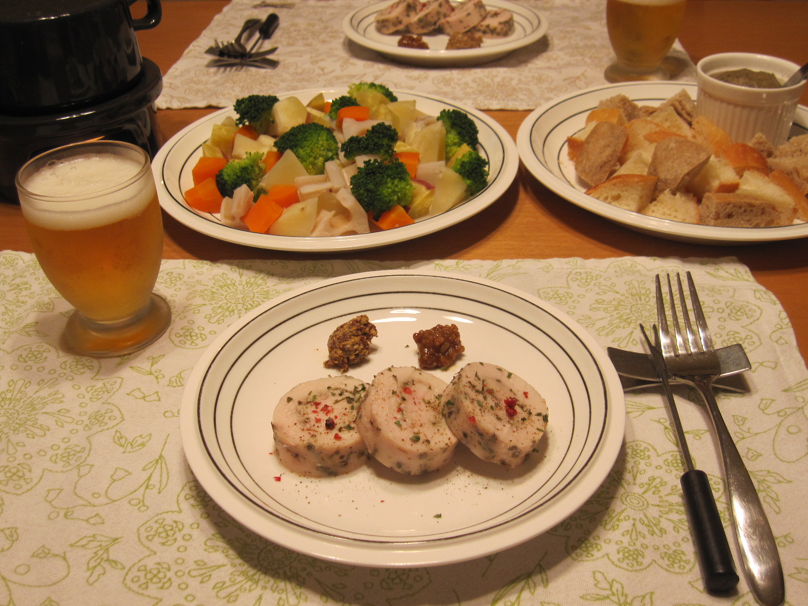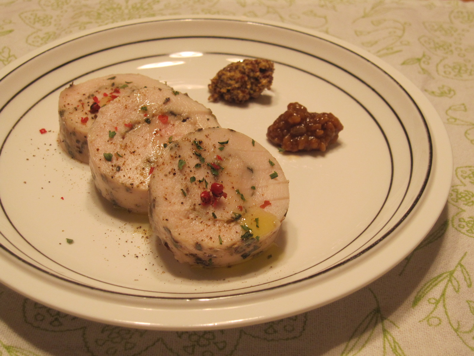 ドライハーブをたっぷりすり込んだ鶏ハム、久しぶりにしてはまずますの出来。