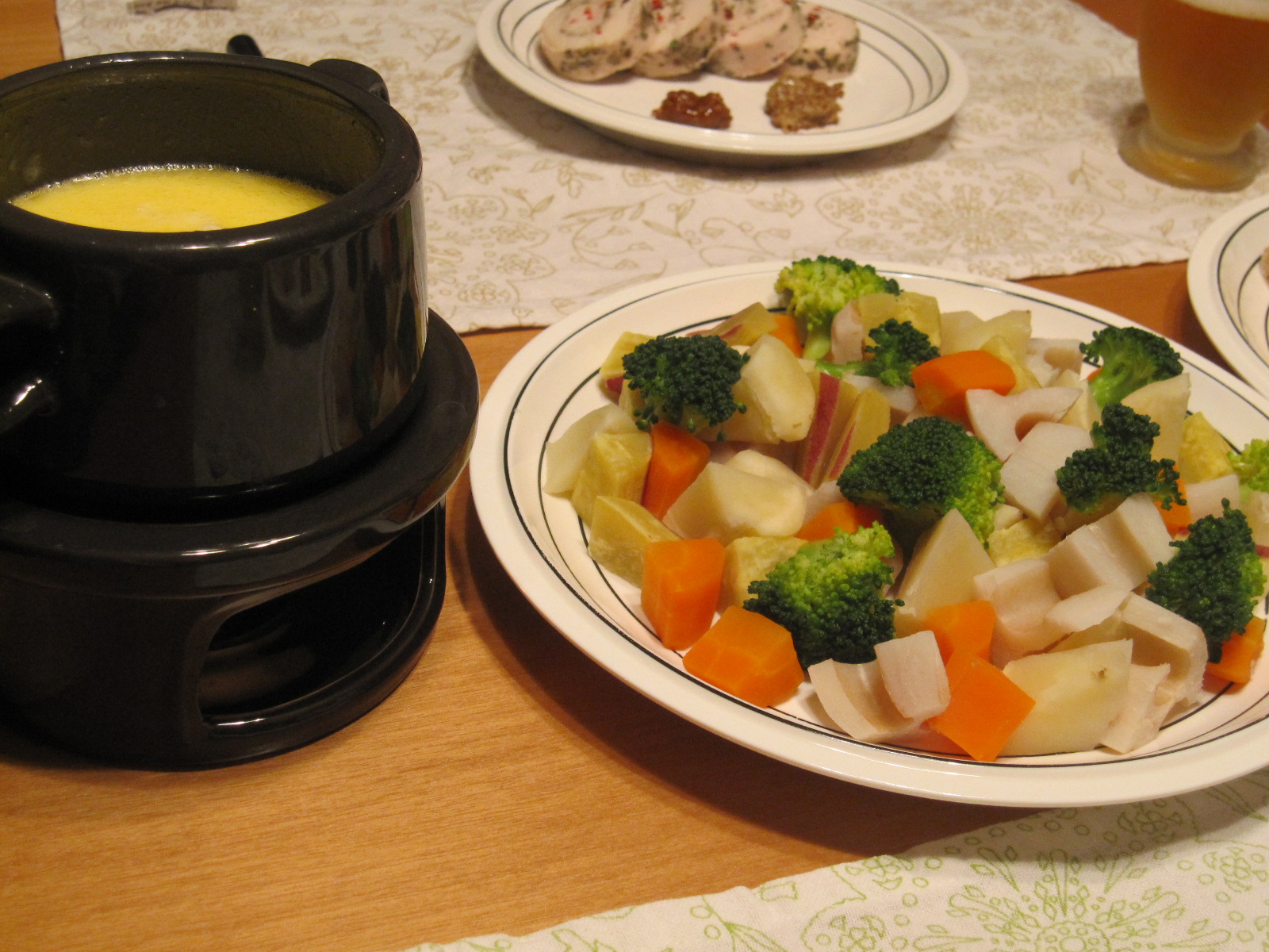 茹でただけの野菜とパンの切れはしでチーズフォンデュ。