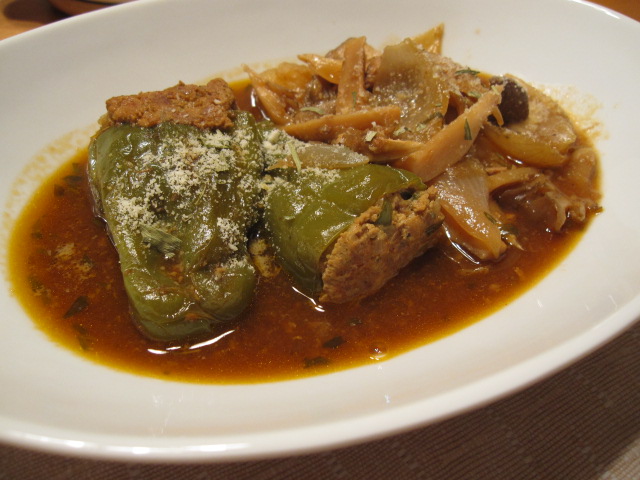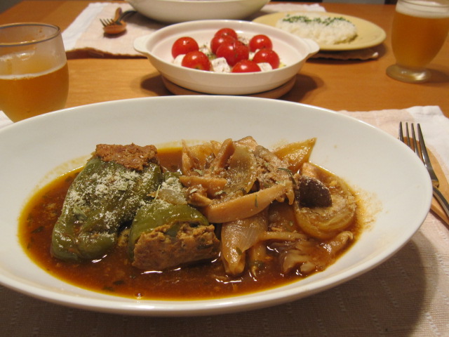 ごろっとピーマンにお肉を詰めて圧力鍋で煮ました。