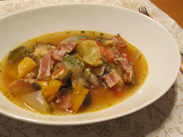 茄子・ズッキーニ・パプリカ・ピーマン・トマト・ベーコン。