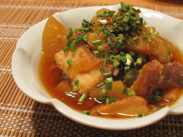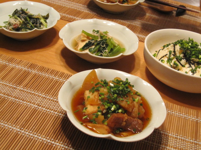 冷蔵庫にあった大根とじゃがいもと厚揚げと一緒に煮ました。
