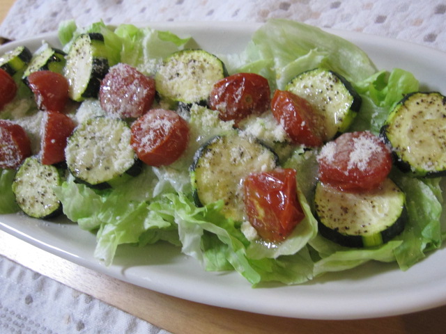 ちぢったレタスの上に、焼いたズッキーニとトマトをのっけて、