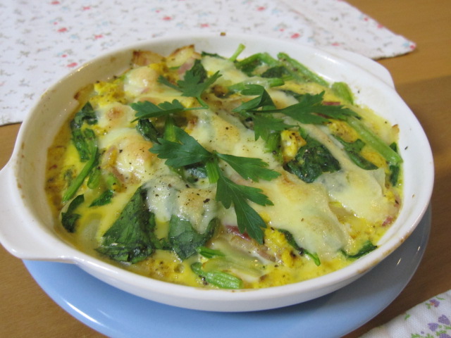 玉葱・ほうれん草とベーコン入りの卵焼きオープンオムレツ。