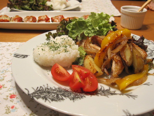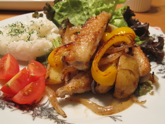 手羽中をじゃがいも・新玉葱・パプリカと一緒に塩胡椒で焼いて、