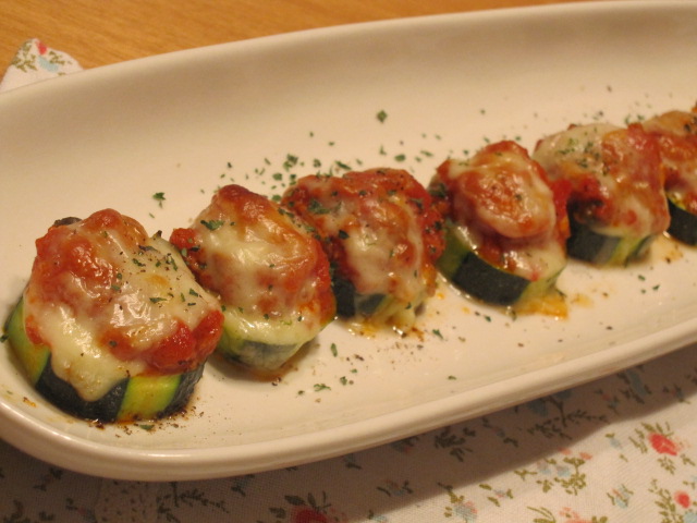 ズッキーニは輪切りにして、上にいつぞやのトマトソースと