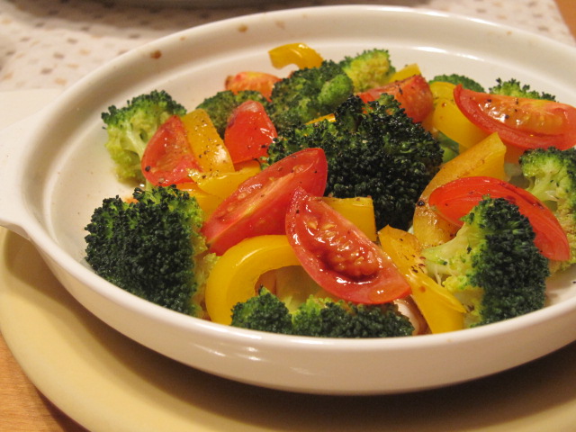 野菜はオーブントースターでチンしてオリーブ油とバルサミコ酢で。