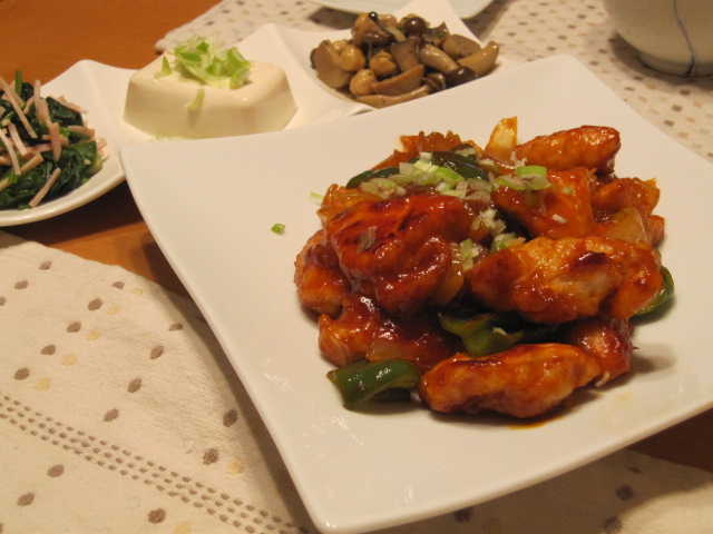 揚げ焼きした鶏胸肉をチリソースにからめました。