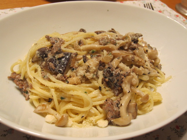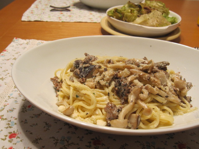 パスタは色々きのこのソテーと挽肉。