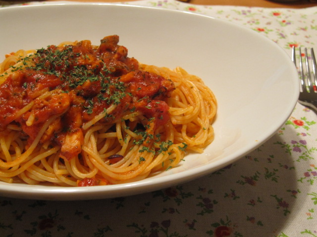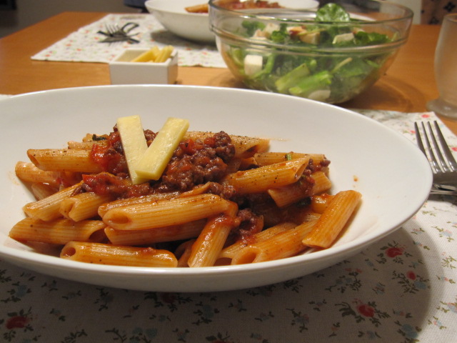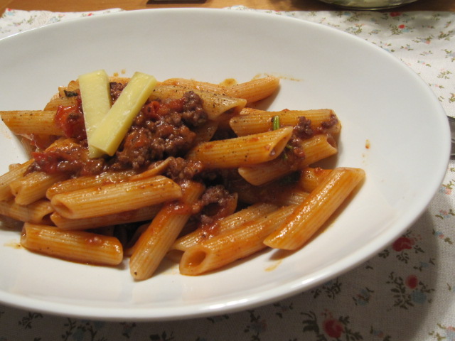 赤ワインを飲みながらつまみ状態でペンネを食べます。