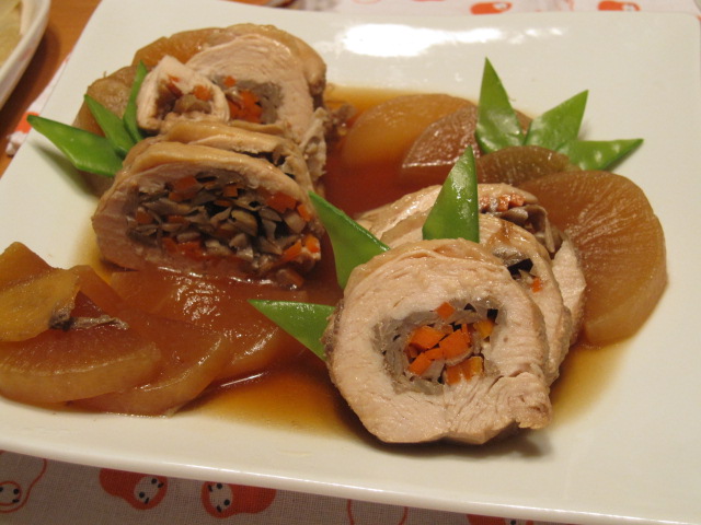 鶏胸肉にささがき牛蒡と人参を巻いて圧力鍋で煮ました。