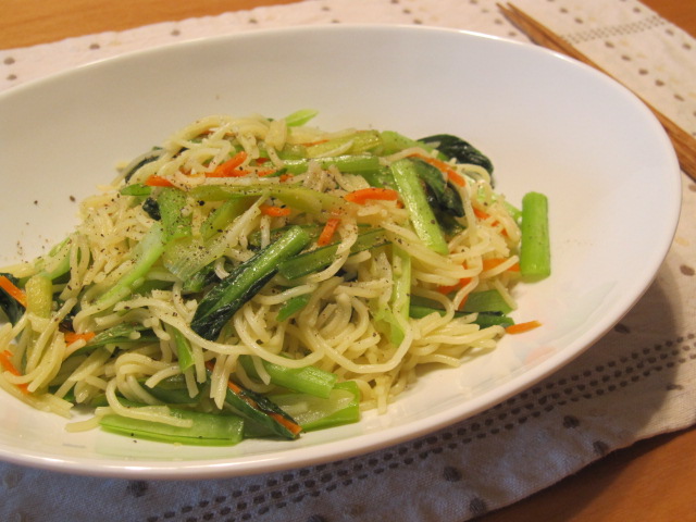 1.中火のフライパンにサラダ油をしき、小松菜と人参を炒める。しんなりしてきたら焼きそば麺を加えて炒める。