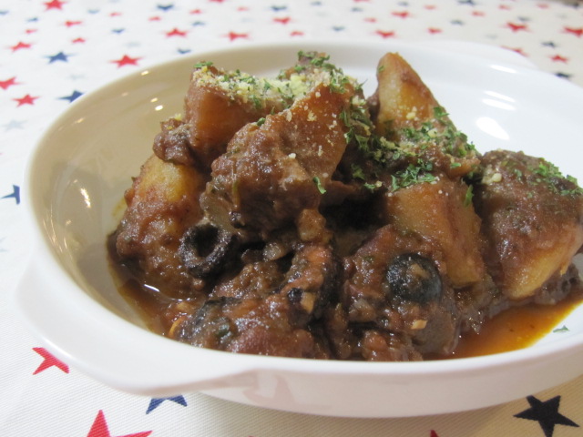 2.じゃがいもに油がまわったらホールトマトを潰しながら加える。赤ワインを加える。