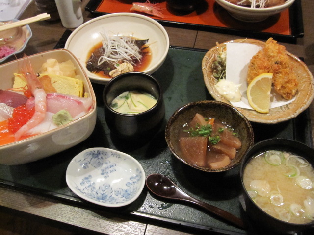 牡蠣フライやら煮魚やらで盛り沢山。