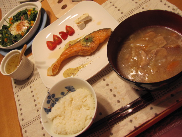 豚汁には風邪が治るように生姜とネギいっぱい。