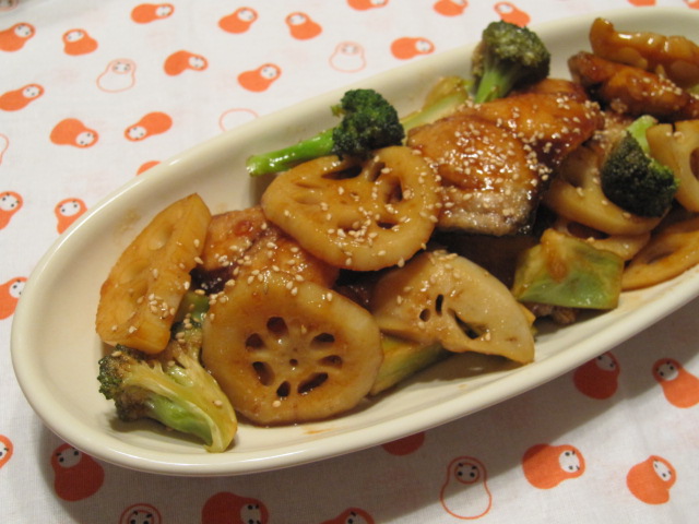 2.フライパンの余分な油を拭き取り、大さじ1杯分のサラダ油をしき、中火で蓮根とブロッコリーを軽く火が通るくらいに炒める。