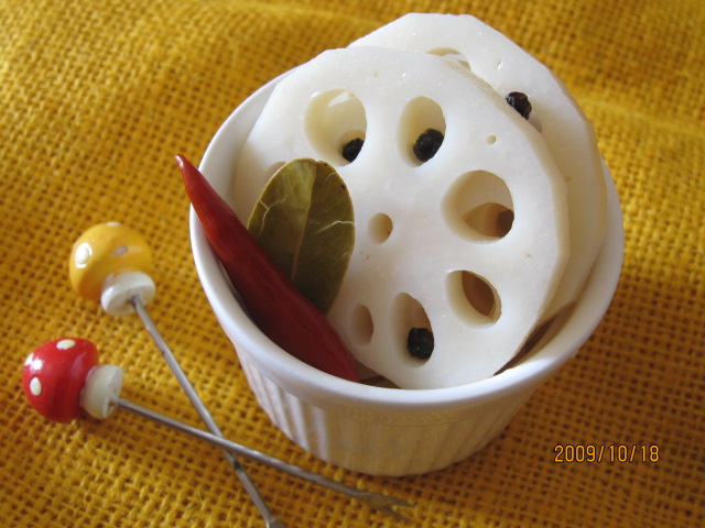 1.◎と蓮根を鍋に入れ、中火で加熱。沸々して砂糖が溶けたら全部を耐熱容器に入れ、鷹の爪・ローリエの葉・粒胡椒を入れてそのまま漬け込む。