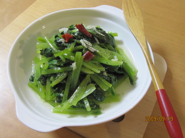 1.弱火のフライパンにオリーブ油・ニンニク・鷹の爪を入れ、香りが出てきたら中火にして、小松菜を加えて炒める。