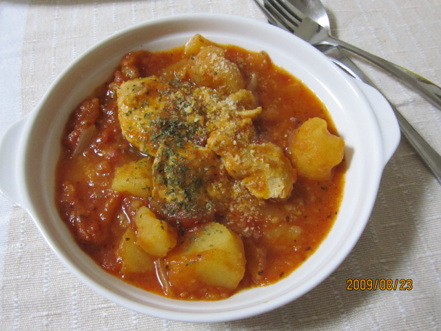 2.1にトマト缶のトマトを潰しながら加え、玉葱・じゃがいも・コンソメ顆粒を加え強火で加熱し、シュンシュンしてきたら弱火で5分加熱し、自然冷却。