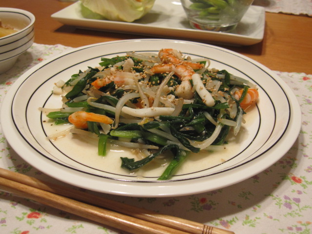 ニラ1束・モヤシ1袋、エビ、味付けはなんとイカの白造り。