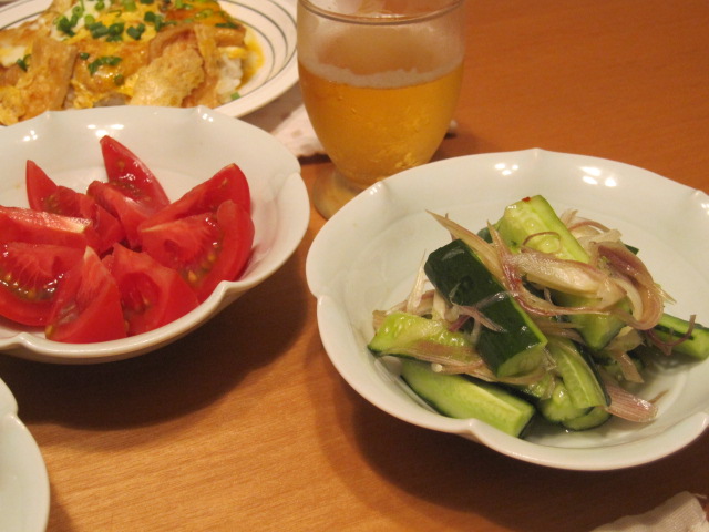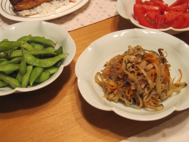 胡瓜と茗荷の浅漬け・冷やしトマト・金平・枝豆。