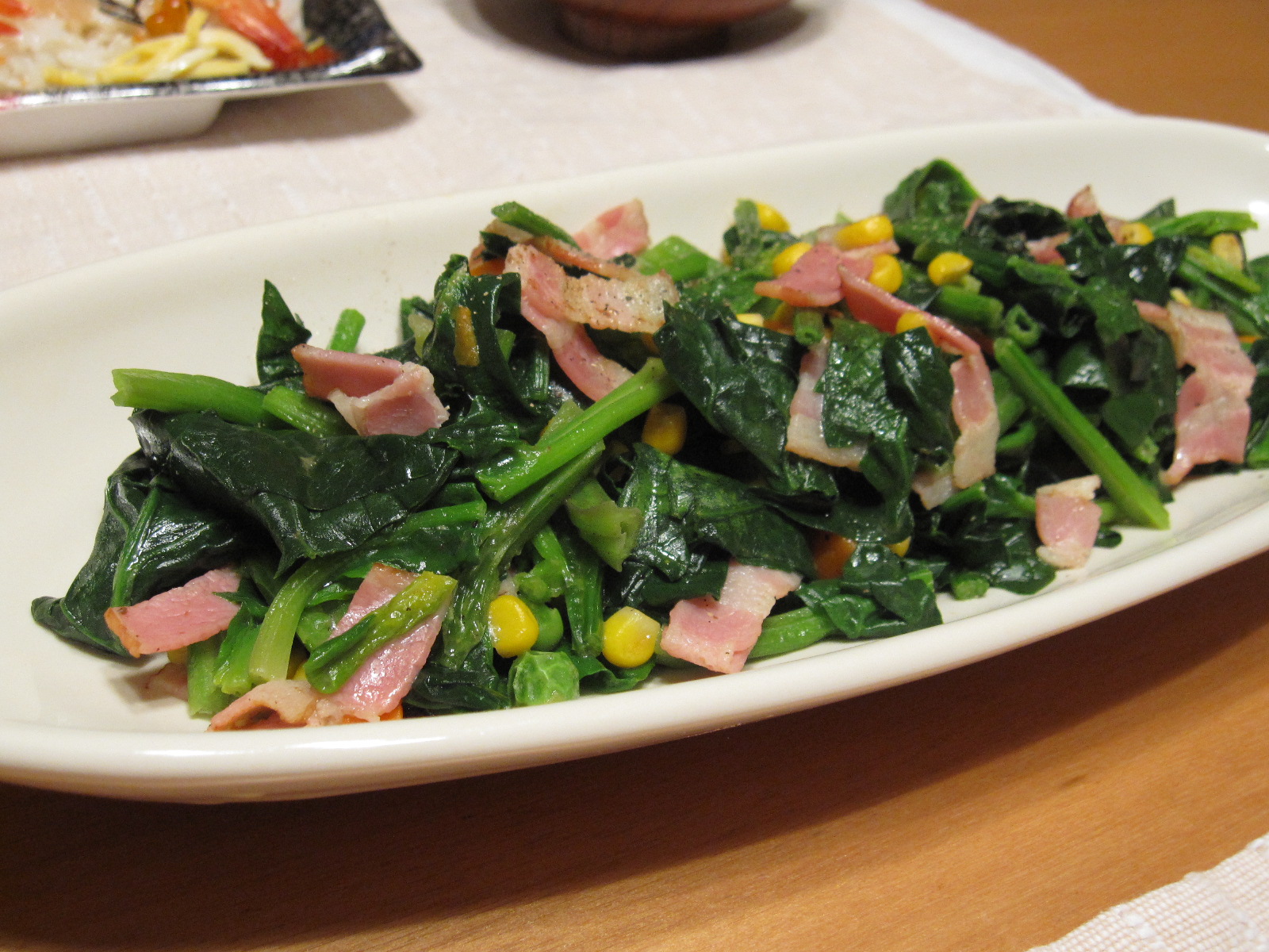 ほうれん草のソテーはベーコンとミックスベジタブル入り。