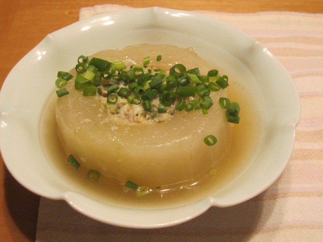 残っていたモーウィをくり抜いて、餃子の残りのタネを詰めて、