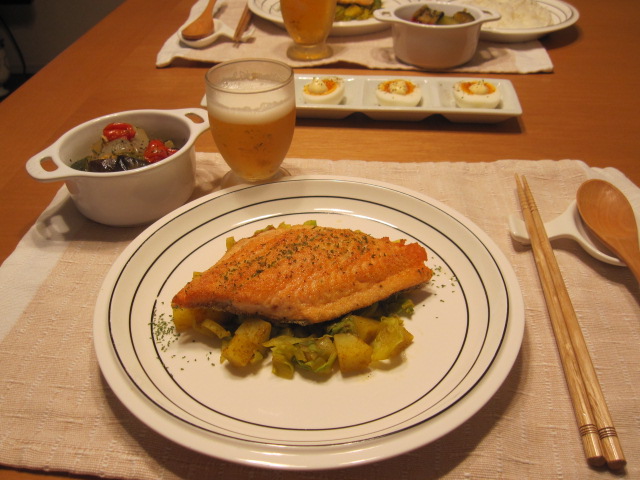 サーモンの下にあるサブジはレシピブログのモニター当選品で簡単調理。