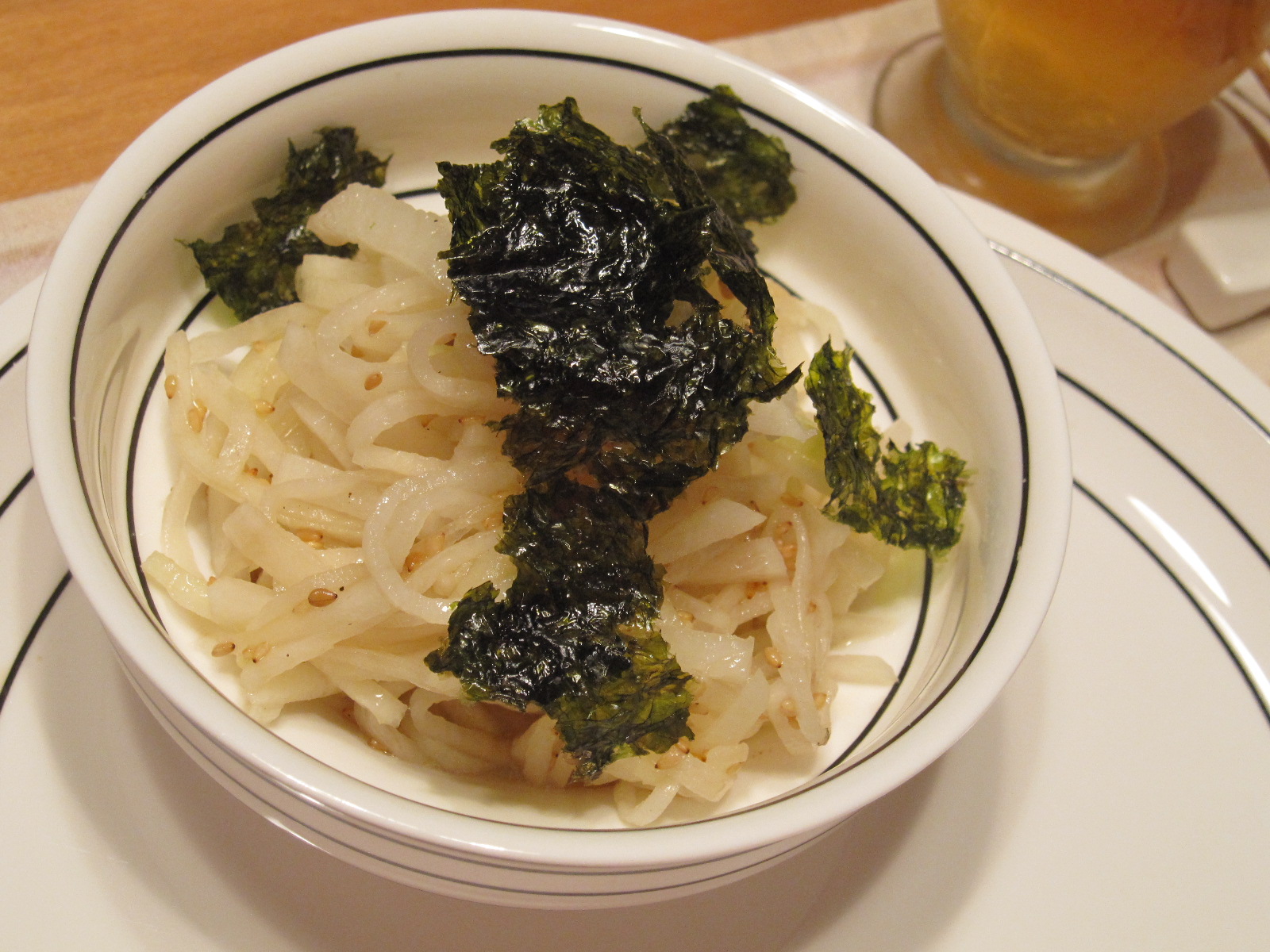 千切り大根(生)を胡麻油と牛肉ダシダと白胡麻で和えただけ。