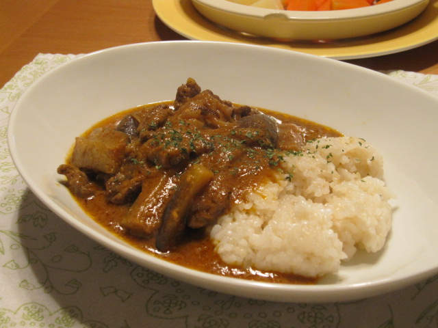 長茄子2本と牛肉、玉葱だけの簡単カレー。